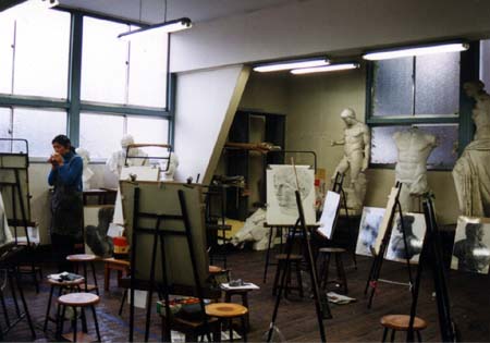 改修前の1階大講義室。デッサンの授業中。注目すべきは天井の梁。三角形の斜材に支えられた成(せい)の高い白い梁が見えている。 白いペンキが塗られた薄ベニアをはがしてみると、角材を上下2段に配し、両側を厚板で打ち付けた「合わせ梁」が現れた。