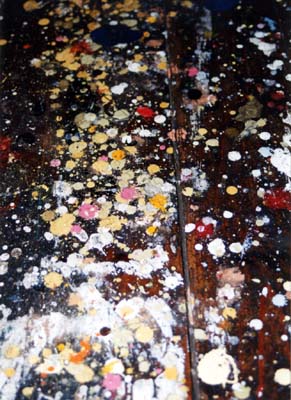 油絵の具が飛散した2階の床。いかにも美術大学という雰囲気のこの床板を、そのまま再利用することにした。 しかし2階は研究室に細分化され積載荷重も増加する。床の根太(ねだ)補強は欠かせない。 床板を剥がすことなく、その下に根太を差し込んでいくという作業は、かなり面倒な工程である。