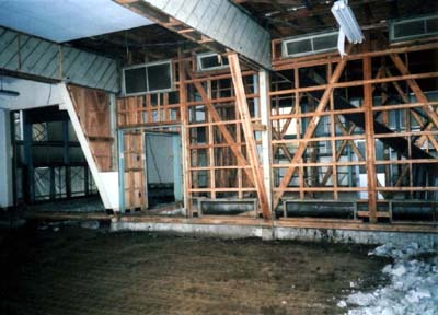 解体中の1階大講義室。水色の板が張られた合わせ梁が天井を支えているのがよく見える。両端部の頬杖をめくるとこんな感じだった。 なお基礎は布基礎。土間(防湿)コンクリートもなかったが、密実なローム層のおかげで不同沈下もほとんと見られなかった。