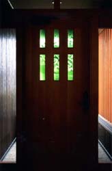 ▲玄関ドア。ステンドグラスを嵌めた木製建具。