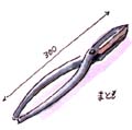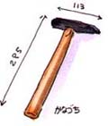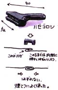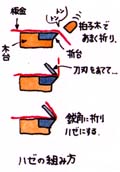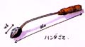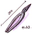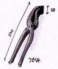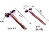 まずつかみ。「掴み」の名の通り、金属板に折れ目をつけて掴みこみ、はぜをつくる基本道具。図のものは刃の長さが38ミリだが、大きいものでは9センチ位まで各種揃っている。 金槌では、鏨(たがね)を叩いたり釘を打つ。大工さんのものとは少し形が違い種類も多い。柳刃は、金属板を切るはさみの一種だが、刃先が微妙に湾曲している。 柳刃の他に、長く直線を断ち切れるまとも(直刃)や、小さなカーブを切るえぐりがある。それぞれに刃の長さのバリエーションがあり、それぞれ「何寸何分のまとも!」などと一目で見分けるのは大変だろうなどと思う。 道具を研ぐのも職人の大切な仕事。はさみ(切り箸と呼ぶ)は「使うよりも研ぐほうが難しい」。二枚の刃が咬みあう角度がわずかにずれても、とたんに切れ味が悪くなる。「切り箸の刃は手が触れても傷つかぬほど鈍いが、使い方が巧みであれば濡れた和紙が切れる」という。道具を最高の状態に保つことは、職種を問わず職人の基本である。