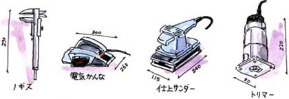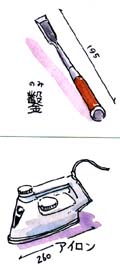 ノコギリには、縦挽き刃と横挽き刃のついた両刃ノコ、片刃で背金付きの胴つきノコ、替刃ノコ、材を途中から切ることができるあぜびきノコがある。 ホゾの加工などで多用する鑿(のみ)は大小約30本も。スパナ類は機械の修理調整に使うものだが、これも30本近くある。 アイロンがなぜここに? 実はちょっとした傷ならば、濡れタオルをあててアイロンをかけると治ってしまうのだ。 |