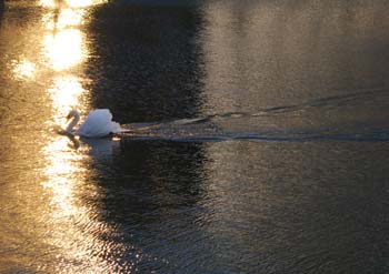 都会の空を映した水辺で、白鳥のコントラストが一層幻想的に見えた。