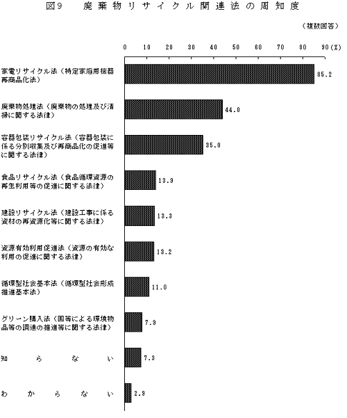 この図は昨年実施されたあるアンケートでの、「廃棄物・リサイクル関連の法律の中でどのような法律を知っているか」という質問に対する回答結果です。家電リサイクル法についてはニュースなどでも取り上げられたのでよく知られていますが、その他の法についてはほとんど知られていないといっていいと思います。 |