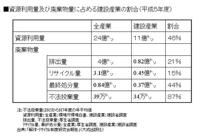 @建設廃棄物の現状 建設産業における資源利用量は、全産業の24億tのうち、約46%の11億tとかなり多くなっています。そのため廃棄物の排出量も当然多くなり、下図のように平成5年、平成9年ともに全産業の約2割を占めるまでになっています。