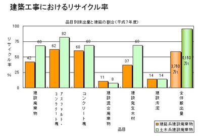 しかし建設廃棄物のリサイクルは伸び悩んでいて、平成5年では排出量に対するリサイクルの割合が全産業で77.5%なのに対し、建設産業では54.8%と低くなっています。 平成7年のデータでは、リサイクル率は土木系廃棄物で68%、建築系廃棄物で42%となり、全体では58%にとどまっています。リサイクルの内訳は下図のようになっています。