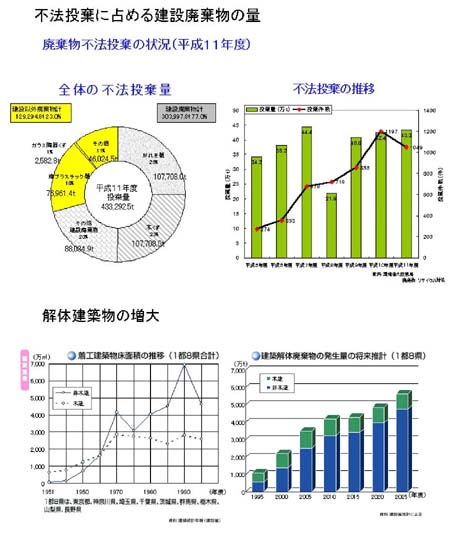 このようにリサイクル率が低いと、結果的に最終処分へまわる廃棄物が多くなってしまいます。建設廃棄物の最終処分量は、全産業廃棄物の最終処分量の約4割を占めるといわれていますが、現在その受け皿となる最終処分場の残余容量が非常に逼迫してきています。そのためコストがかなり高くなってしまい、廃棄物の不法投棄にもつながります。不法投棄に占める建設廃棄物の量は平成5年で約9割、平成11年で約8割と減少傾向にはありますが、非常に高い割合となっています。 今後、建築系廃棄物の排出量が急増することが見込まれていることからも、できるだけ廃棄物の量を減らし、より一層リサイクルを促進することが課題となるのではないでしょうか。