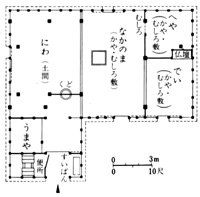 ▲同平面図「にわ」は土間、それ以外はむしろ敷きの土座であった。最奥の「へや」のみ建具で仕切られる。