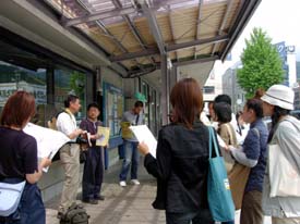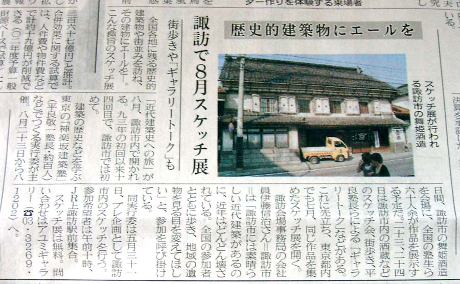 近代建築史への旅第14回スケッチ展のプレ企画として、6月1日(日)に行なわれた「上諏訪まちあるき+スケッチ会」には、関東近県を中心に、スケッチ展出品者や神楽坂建築塾塾生、美術塾塾生、インターネットからの参加者など16人が集まりました。 前日は台風が来て諏訪地方は雨が降ったりやんだり不安定な天気で、当日はどうなることかと思いましたが、最後まで雨が降ることなく無事終わることができました。 |