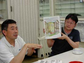 今度は上諏訪駅の西側にある諏訪湖の湖畔へ行き、千人風呂で有名な煉瓦造りの建物、片倉館を見学しました。昔は片倉館のすぐ傍まで諏訪湖が来ていたそうですが、現在では埋め立てられてカリン並木ができています。この通りには、木製建具が壁面に敷き詰められた3階建ての旅館もあります。 各自それぞれに近代建築を楽しみ、15時の集合時間までスケッチ。三村貴金属店に再集合して講評会がもたれました。参加者からは、「地元の方に話しかけられビールまでご馳走になった」「私はあんパンをいただいた」「8月のスケッチ展のことを話したら興味を持たれ、『その時は見に行きます』と言われた」など、地元の方との交流を楽しんだ様子が語られました。 諏訪は温泉で有名なまちですが、近代建築もひっそりと残る歴史あるまちでもありました。準備していただいた伊藤信治さん、ありがとうございました。【遠山 元】 |