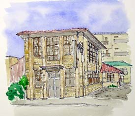 諏訪の市街地は初めての訪問でしたが、これほどまでにすばらしい建築物が残されていることに驚きと嬉しさがこみ上げてきました。とても一日や二日で歩ききれる物でもなくできれば一週間くらい滞在してスケッチして回りたいと思いました。スケッチをしている見ず知らずの私に優しい言葉と冷えた缶ビールをくださったお孫さん連れのおじいちゃん。大変ごちそうさまでした。また描きに行くので宜しくお願いします。今度は温泉もゆっくりと入りたいな。【M.A】 |