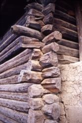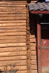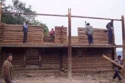| ▲古番付が書いてある井幹式住居(木楞房/ムールンファンとも呼ばれる) | ▲ 木楞房隅部 | ▲木楞房を再生する |