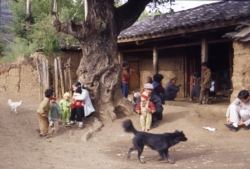 | ▲焼酎をつくるためにトウモロコシが屋根一面に乾されている。集落が遠望できる | ▲ 古木のある小さな広場に老人や子供や家畜たちがくつろいでいる |