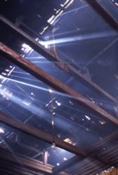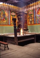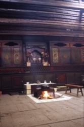 | ▲ 屋根のすき間から差し込む光が黒光りする内部空間を照らす。囲炉裏の煙によってその光が一層強調される様子は、木楞房の空間をより神秘的なものに感じさせる | ▲母房。神棚と囲炉裏を見る。左手にはこの家を治めている楊直瑪さんのお母さんのベッドがある | ▲ 母房には二つの囲炉裏があった。客人である我々はこの上段の囲炉裏で夜はいつもくつろいでいた。火を囲んでモソ人と談笑していたのである |
