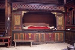 | ▲ 母系社会を象徴的に表わしている楊直瑪さんのお母さんのベッド | ▲ 楊直瑪さんのお母さん。彼女がこの家の長である |