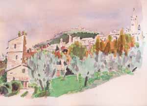 アッシジでは街全体を描きたくて、延々と歩きました。道で拾った段ボールを敷いて、風よけの為ゴミ箱の影に座り、岡田さん、魚谷(幸)さんと3人で描きました。 足は血まみれだし、風に吹かれて寒いし、こんな大変な思いをしてよくやるなと自分でも思いますが、やっぱりスケッチは良いです。