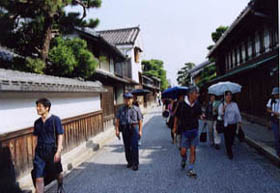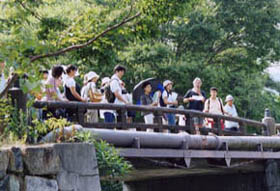 汚濁と異臭から埋立て事業が決定したにもかかわらず市民の真剣な呼びかけによって浚渫が実現、見事によみがえった「八幡堀」の水辺からスタート。猛暑の中、NPO法人「一粒の会」メンバーやボランティアガイドの丁寧な説明を聞きながら散策しました。近江商人の故郷としての歴史あるまちなみ(伝統的建造物群保存地区)も見学し、ヴォーリズの建築の前では、そこに住む人間を第一に考えたヴォーリズの設計思想と人となりをも実感しました。