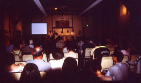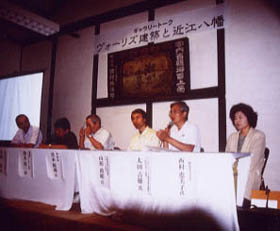 ヴォーリズの精神を現代に 3時からは、展示会場隣の蔵を改装したオープンスペース「酒游舘」でギャラリートーク「ヴォーリズ建築と近江八幡」が、約95名の参加で始まりました。 登壇したパネリストは6名。 旧八幡郵便局(1921年・ヴォーリズ設計)の再生を続けるNPO法人「一粒の会」会長の太田吉雄氏は、廃屋状態であった郵便局を「まず掃除をさせてくれ」と所有者にかけあったところから再生運動がはじまった経緯を紹介。 八幡堀を守る会の西村恵美子氏(酒游舘オーナー)は、「埋立てた時から後悔が始まる」との合言葉ではじまった堀の再生運動の30年を振り返り、「あんな汚い堀なんか……」と言われながらも、急がず焦らずゆるやかな活動を続け、住民のネットワークを広げてきたことを報告。「これからは水質浄化が課題。私が生きているうちにきっと清流を取り戻したい」と熱く語りました。 近代建築収集家としても知られる宮本和義氏(写真家)は、「全国3000件ほどの近代建築を見てきた。その中で、洋と和が交じり合って景観を作り上げている面では近江八幡に並ぶところはない。実は昨日まで郡上八幡にいたのだが、郡上には清流があり、一方近江八幡にはヴォーリズがある。まちというものはやはり最後は“人”で決まる。その意味でも近江八幡はとても魅力的なまちだ」と感想を語りました。そして「新しい変な郵便局が増えているが、隣の旧郵便局の方がはるかに素晴らしい。どうしてここを郵便局として使わないのか」と訴えました。 スケッチ展呼びかけ人の鈴木喜一(アユミギャラリー主宰)は「古い建物をスケッチする」ことを訴えました。「描くという行為が、建物と自分との距離を近くする。まちの人に声を掛けられれば更に一歩そのまちに近づいたことになる。後から絵を見れば、その時のことを明瞭に思い出すことができる。そんな建物との対話を、50人、100人が全国で続けていけばきっと大きな力になるだろう」と語りました。 司会の寺田弘氏(神楽坂地区まちづくりの会会員)は、「『人の心はまちの形に似るものだ』という言葉を阪神大震災後の急ごしらえの復興の中で聞いた。たしかにまちがわれわれを育て、またわれわれがまちをつくりあげるのではないか」と語り、更に会場からの意見や、運動を進めていく上での課題などについても議論が交わされ、最後に西村さんが「本物に触れた時に人はホッとするのでしょう。大変さはありますが、時を超えて訴えてくる価値を引き継いでいきたい」と結びました。 ツアーメンバーはその後商店街の夏祭りで屋台を巡り、「登録文化財に宿泊できる」ことで有名な近江八幡ユースホステルに移動し、夜が更けるまで懇親会で地元メンバーとの交流を深めました。 この日のまちあるき及びギャラリートーク参加者の感想文はこちらです。 なお26日は朝から、地元実行委員会による「ヴォーリズ建築スケッチツアー」が独自に開催され、子ども連れなど30名が集まり、ヴォーリズと身近なまちの再発見をしながら絵筆を走らせていました。こちらは27日付の新聞各紙に大きく報じられ、記事を見て旧郵便局に来場する市民の姿もありました。