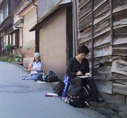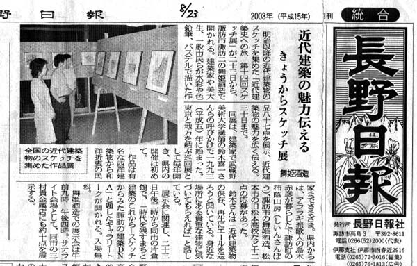 近代建築史の旅・第14回スケッチ展は、8月23日(土)、長野県諏訪市にて諏訪展がスタートしました。 初日の23日(土)正午、汗ばむような日差しの中、上諏訪駅にはツアー参加者が続々と参集。 重厚な蔵作りの舞姫酒造は諏訪を代表する造り酒屋で、ここの2階座敷を中心に諏訪の大工さん有志がコンパネで大型キャンバスを仮設し、約60点の作品を展示してあります。朝から諏訪入りしたメンバーは、早速道路を挟んでスケッチを始めていました。