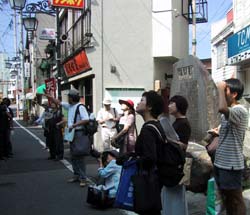 全国の近代建築を「採集」しつづけている写真家の宮本和義氏が、「せっかくのいい建物たちが、後補のアーケードや電柱によって見苦しくなっている。これらを取り除いて、建物に再び舞台に出て欲しい。またどんどん壊してはつくっている建築家たちに、もっと見識を持て、といいたい」と発言。それに対してサテライト会場の三村貴金属店社長が「電柱とアーケード撤去は商店街でも議題に登っている」と応えました。