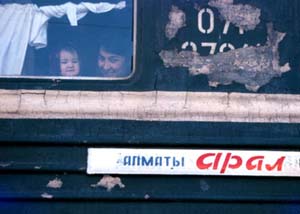 アルマトィII駅のホームでは、ニュクス行きの国際列車アラル号が出発を待っていた。 中央アジアの冬は寒く厳しい。 それゆえ車窓に映る人のぬくもりは旅人の心も暖める。